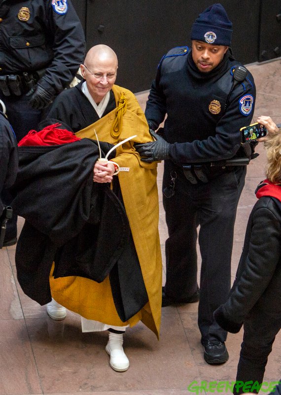 Después de la charla, cientos fuimos al edificio del Senado, donde 138 de nosotros fuimos arrestados en un acto de desobediencia civil. Fue bueno estar allí con Jane Fonda, Gloria Steinem, Eve Ensler, Dolores Huerta, mujeres mayores, y muchos otros que están profundamente comprometidos con el cambio de las políticas y comportamientos en torno al cambio climático.
